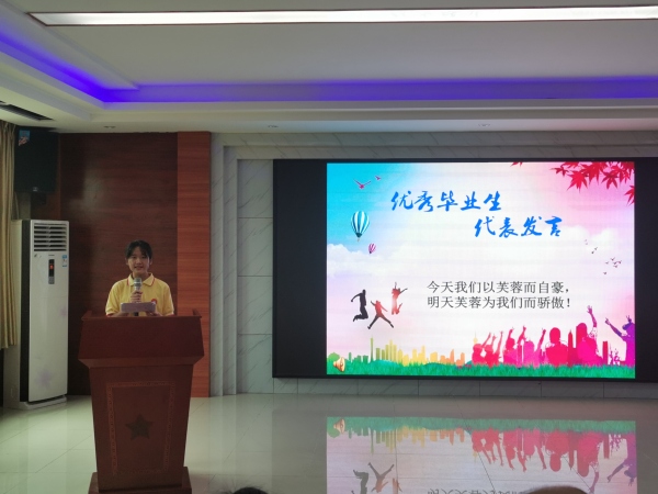 接著,進行優秀畢業生表彰。在《畢業歌》聲中,優秀畢業生邁著自信的步伐,走上了頒獎臺,學校領導為其頒發了證書及合影留念。隨后,優秀學生代表和家長代表用自己真摯的語言滿懷深情地表達了對學校及老師們的感激之情。