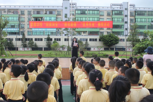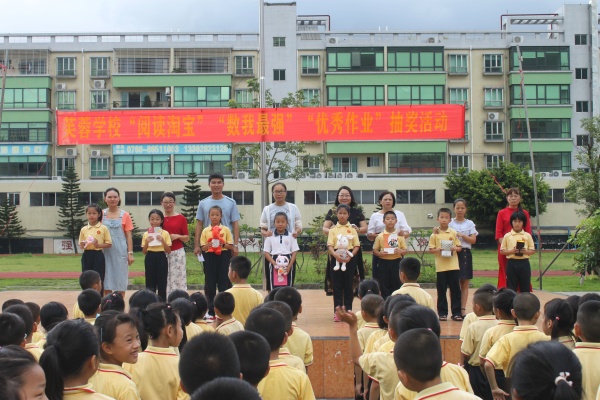 6月24日上午,芙蓉學(xué)校舉行閱讀淘寶暨閱讀考級(jí)頒獎(jiǎng)活動(dòng)。活動(dòng)在芙蓉學(xué)校操場(chǎng)舉行,當(dāng)主持人宣布閱讀淘寶活動(dòng)正式開始,芙蓉學(xué)校的教師們就拿著準(zhǔn)備好的精美禮物走上抽獎(jiǎng)臺(tái)。隨著抽獎(jiǎng)音樂(lè)聲響起,一位位幸運(yùn)兒誕生了,被老師抽到并得到獎(jiǎng)品的同學(xué)臉上都洋溢著燦爛的笑容,活動(dòng)現(xiàn)場(chǎng)充滿了歡聲笑語(yǔ)。