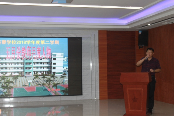 會上,首先由李俊老師公布5月月度人物獲獎名單并為其任宣讀月度人物頒獎詞,獲得5月月度人物榮譽稱號的分別是小學部艾袁園老師、田慧丹老師和初中部李毓勝老師。隨后,由田慧丹老師代表與大家分享教學心得。田老師是一位有責任心,工作踏實,對人熱情真誠的老師。她熱愛教師這個崗位,更熱愛自己的學生。在工作中注重對教學方法的探索,對教育方式的研究課堂上寓教于樂,尊重信任學生。在“芙蓉好課”的初賽、決賽中屢獲好評,她在磨課賽課中不斷探索、大膽創新,為大家呈現了非常精彩的課堂教學,贏得了大家的一致好評。最后,由翟軍校長為三位5月“月度人物”頒發證書。