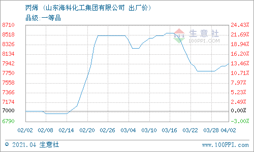 4月2日,山東海科化工集團有限公司丙烯最新報價上調,漲50元/噸至7950元/噸。