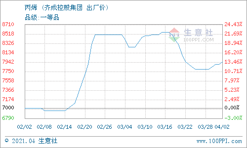 4月2日,齊成控股集團丙烯最新報價上調,漲50元/噸至7950元/噸。