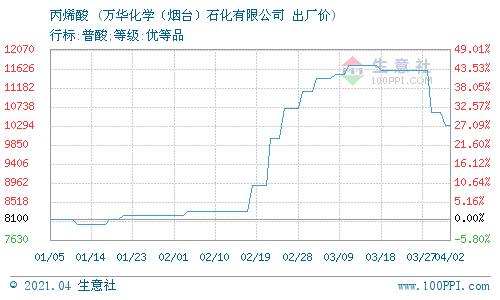 3月31日,萬華化學石化丙烯酸(華北)最新報價在10500元/噸,較上一交易日相比持平,實際成交價以協商為主。