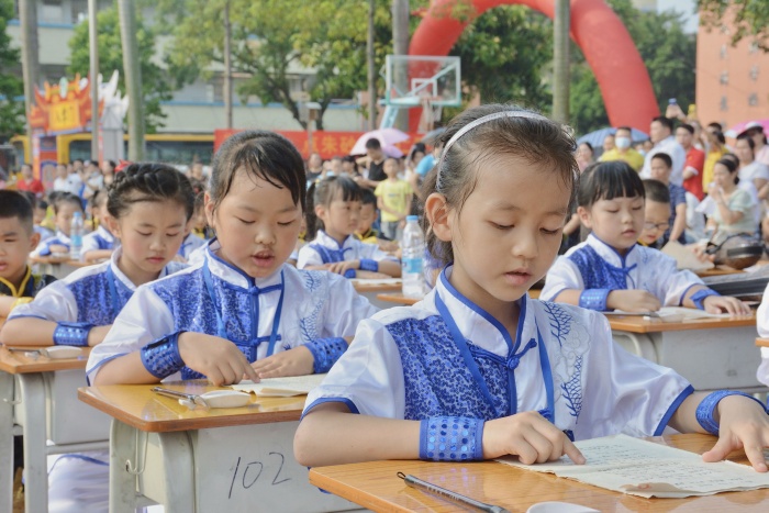 本次“開筆禮”按照“入場”、“整裝習禮”、“孝親敬師”、“朱砂啟智”、“擊鼓鳴志”、“啟蒙描紅”、“禮成退場”等環節為同學們開筆啟蒙。