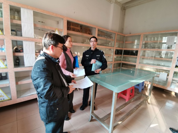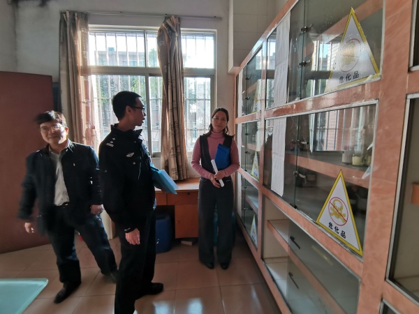 12月20日下午,東鳳鎮橫瀝派出所劉所長、教指中心黃美英老師等到東鳳二中進行易制毒、易制爆等危險化學品的安全檢查與指導工作。東鳳二中胡發良副校長、總務處顧永進主任、化學備課組老師、實驗室負責人陪同檢查。