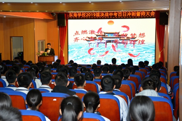 中考百日在即,為了讓初三畢業(yè)班全體師生以飽滿的熱情、昂揚(yáng)的斗志,凝心聚力,充分發(fā)揮這一百天的備考功效。3月8日上午,借農(nóng)歷二月二龍?zhí)ь^的美好寓意,東海學(xué)校在多媒體室隆重舉行2019屆決戰(zhàn)中考百日沖刺誓師大會(huì)。 王強(qiáng)校長(zhǎng)、政教處李子榮主任、教務(wù)處呂萬(wàn)春副主任、齊勉達(dá)副主任、余磊助理、吳雪超助理及初三全體師生參加了此次誓師大會(huì)。大會(huì)由政教處程玉濤助理主持。