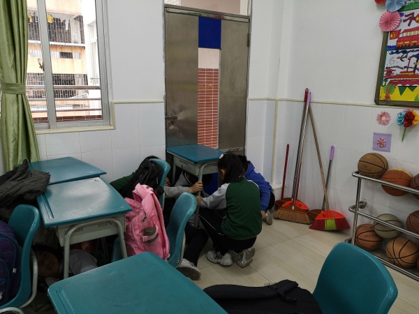 廣播提示完畢,教師們迅速組織還在室外的學生返回教室或其他緊急避險場所。隨后馬上指揮學生緊閉門窗,拉上窗簾并關燈,用課桌、木柜頂住門窗,防止“暴恐分子”破門窗而入。緊接著各班學生自覺快速地躲到桌子下方,安靜等待。