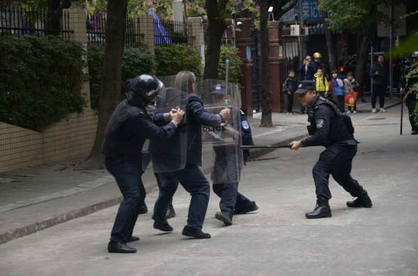 肖凱贊主任接到警報后第一時間組織防暴應急小組前往出事現場。所有防暴組成員持器械迅速到達教學樓樓下,分工據守對應樓道,阻止“暴恐分子”進入教學樓。應急指揮小組也調動各方力量,集中力量到“暴恐分子”突擊的入口,盡量拖延時間,等待警察的到來。
