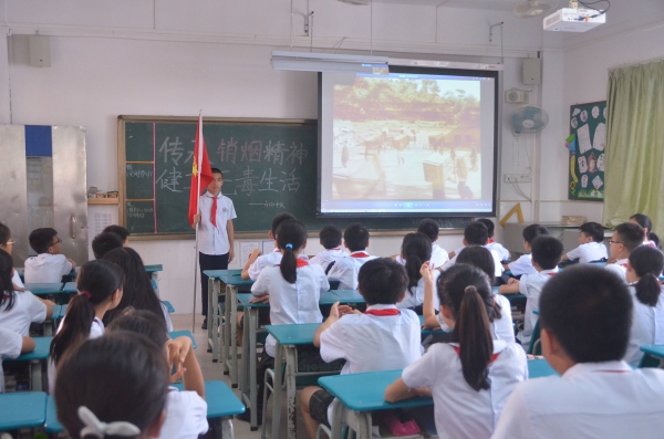 當天上午,升旗儀式后,分別由二(1)班和四(4)班學生代表向全校師生作“傳承銷煙精神,健享無毒生活”為主題的國旗下講話。講話中回顧了180年前虎門銷煙那段波瀾壯闊的歷史。在清朝實行閉關鎖國的時候,歐洲資本主義國家迅速崛起,英國資產階級把鴉片輸往中國大獲其利。由于鴉片大量輸入,造成白銀大量外流,擾亂清朝的國庫和貨幣的流通,使清朝的經濟面臨崩潰邊緣。更為嚴重的是鴉片的泛濫極大地摧殘了老百姓的身心健康,如任其發展下去,中華民族面臨滅亡的危險。民族存亡的緊急關頭,有識之士林則徐疾呼為了國家的尊嚴,必須禁煙。道光皇帝派林則徐前往廣州查禁鴉片。180年前的今天,也就是 1839年6月3日,林則徐下令在虎門海灘當眾銷毀鴉片,至6月25日結束,共歷時23天。這次銷煙于國人而言,可謂是救國的銷煙,救民的銷煙。