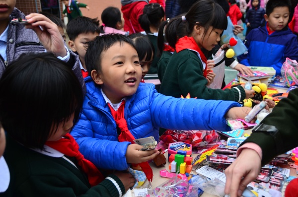 活動前期,隊員們慷慨地捐出自己閑置的學習用品、書籍、玩具、手工藝品、飾品、個人書畫作品等來義賣,各中隊通過自主招募,成立了銷售團隊。根據學校少工委發出的倡議,檢查所有的義賣物品是否健康有益,并各出奇謀地制定銷售途徑???,活動現場,他們紛紛使出渾身解數熱情地招攬著前來選購的顧客!豐富的展品和興高采烈的師生愛心買家們點燃了整個校園的熱情。