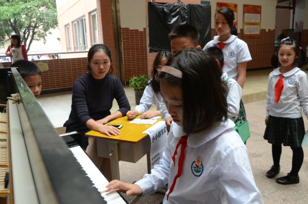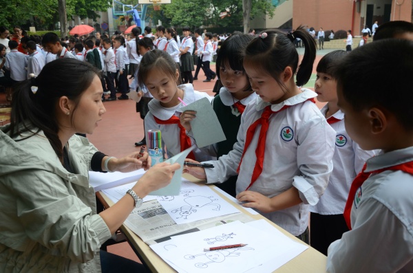 本次藝術節開幕式不同于以往觀看表演節目的傳統方式,而是改成了全體學生都可以參與進來的校園藝術游園活動。這次活動共有30個不同內容的藝術游戲攤位,每個攤位的活動形式都是藝術科組老師們精心策劃準備的,比如“盲人擊鼓”、“吹出來的怪物”、“Do大哥漂流記”、“水寫字”等等各種游戲,涵蓋了美術、音樂、書法、心理各藝術科目。學生們興高采烈地參與其中,有的在攤位前聚精會神地描畫著心中的美好畫面,有的手里拿著小剪刀秀一秀自己的紙藝特長,有的在節奏游戲攤位上自信大聲地拍打著節奏,有的看著字母譜卡片肯定的唱出一個個靈動的小音符……看著自己手中的雛鷹章個數呈幾何數增加,每個同學的臉上都洋溢起了幸福的笑容。活動歷經一個小時結束,同學們揣著收獲滿滿的爭章紙,排著整齊的隊伍回到課室,在班主任老師那里領到了自己心儀的獎品。