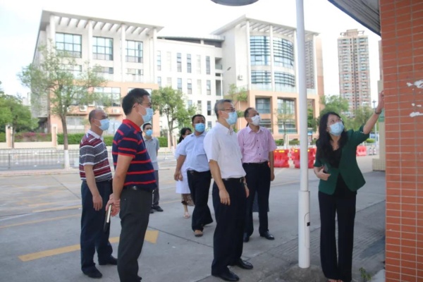 郭衛華主任一行按照“高”、“準”、“深”、“實”的標準和要求,深入教室、飯堂、臨時健康觀察室、校醫室、臨時監測點等重點區域檢查防控措施落實情況,仔細核查學校疫情防控工作相關制度、疫情應急處置流程、防控知識宣傳、學生復課方案等資料,并實地察看醫務室和防疫物資儲備情況,聽取線上教育等情況介紹,認真分析研判,對該校創新舉措、采取務實有效辦法做好復學準備工作給予充分肯定。同時,郭主任一行對校門左側建筑紅線區改造成放學接送區表示大力支持。