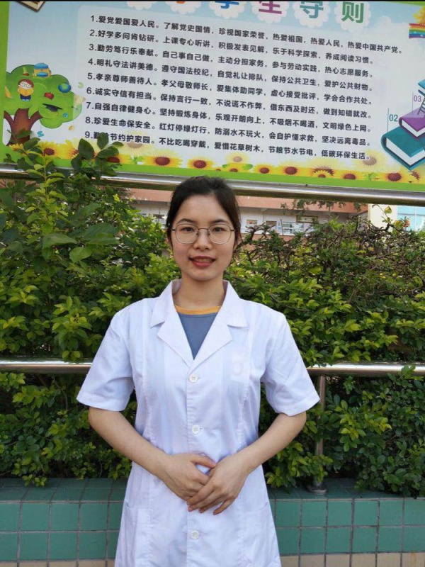 陳婷婷老師既是學校的校醫,也是衛生教師,每天面對著活潑可愛的小學生,她的日常工作是幫助他們學習、了解、掌握有關預防疾病、合理膳食、合理用藥等維護健康的知識與技能,增強自我主動健康意識,不斷提高健康管理能力。看著孩子們的成長,陳婷婷老師覺得很有成就感,很享受這份工作。