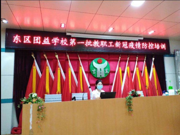 4月13日,陳婷婷老師接到東區教育事務指導中心給她的新任務,前往協助東區團益學校準備物資、設置臨時隔離區、健康觀察點,參加應急演練,迎接返校前上級單位的各項檢查,給初三返校教職工開展新冠肺炎疫情防控知識講座,給保潔人員、食堂工作人員講解消毒劑的配制等。