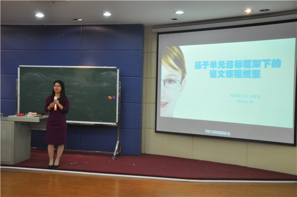 下午,余老師為全體新教師做了《基于單元目標框架下的語文課程統整》專題講座,她期待新教師不僅可以看到自己的教育教學的現狀,更應該清晰地知道把目光投向更遠的地方,把握教育的最新動態和發展方向。在講座中她清晰的介紹了“課程統整”及自己團隊的實踐,以具體課例的設計操作進行分享,讓新教師有所思考。“目標先行”是余主任一直倡導和推行的,她希望新教師可以在自己職業生涯最辛苦、最茫然也是成長最快的三年里,既要腳踏實際做好日常工作,又要仰望星空,找到自己職業生涯的偉大夢想。教師們紛紛把握機會,向余老師提出自己教學乃至班級管理工作方面的困惑,余老師都一一講解。