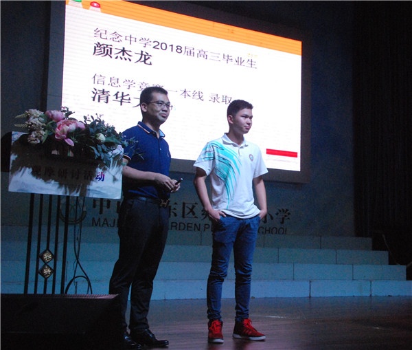 緊接著,莫星華老師開展了主題為《遇見未來,攜手同行》的講座,講座開始部分,他請來了市紀念中學高三并剛被清華大學錄取的顏杰龍同學講述了自己的成長歷程。他說良好的家庭氛圍、父母耐心的陪伴和民主的教育方式,對他的成長有很大的促進作用。接著,莫老師把他對教育的理解、對親子閱讀的體會、對新生家長的希望一一進行了分享,贏來家長們的陣陣掌聲。