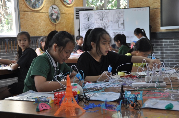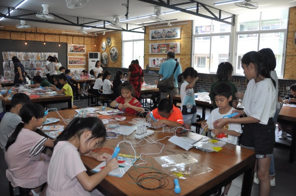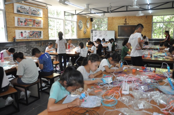 參賽同學都全神貫注地投入比賽。瞧,這是機器人現場拼裝賽的同學,他們三人為一組,在那么多五顏六色的零件中挑選出自己所需材料,現場構建一個模型,多認真啊!這是科學幻想繪畫賽的同學,他們一會兒沉思,一會兒揮筆描邊、涂色,多專注啊!3D涂鴉筆繪畫好特別呀!臺面一排插座,電線連接下的筆會噴出繪畫所需材料,然后繪成一幅幅畫,有些畫還是立體的哦!