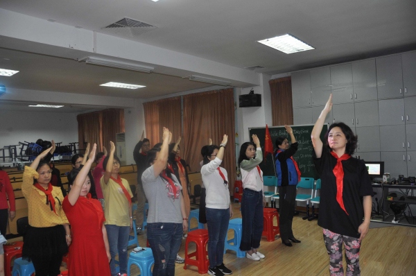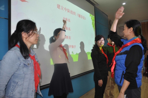 此次培訓采取模擬活動課這一特別的形式,各中隊輔導員擔任模擬活動的隊員,鄭校長擔任中隊輔導員。從“班會課與少先隊課的最大不同點”這一問題開始引導大家進行思考,意識到活動儀式的重要。接著大家開始成立小隊,民主推選小隊長、中隊長、旗手、護旗手、隊歌指揮員等,中隊輔導員鄭泳娜為各隊干佩戴標志。然后馬姝遜從隊禮、檢查人數、出隊旗、唱隊歌等完整的活動儀式手把手地對大家進行指導、規范。