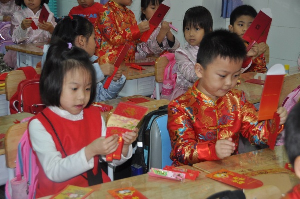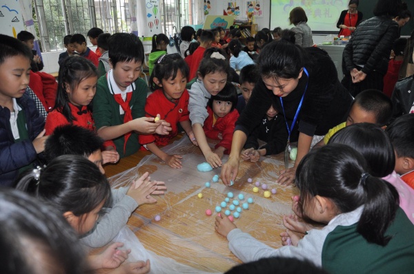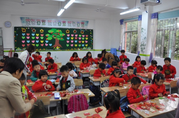 盡管由于雨天關系,游園活動改在室內舉行,但是大家興致不減。下午2:40,新年祝福歌曲的旋律在校園上空回蕩,歡快而又激蕩人心的鑼鼓聲又響起,各班的體驗活動開始了,有做糯米糍的、做湯圓的、包餃子的、煎年糕的;做鞭炮、踢毽子、舞龍;寫福字、踩高蹺、變臉譜、丟沙包……總之,每個年級,每個班級活動各不相同,各具特色。