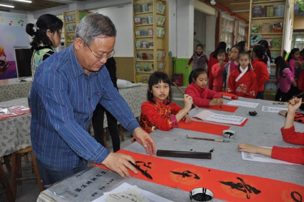 竹苗書吧里,有書法特長的家長志愿者教孩子們寫春聯。