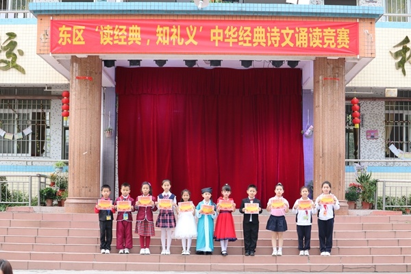 在這場朗誦比賽中,個個選手都發(fā)揮得極其出色。評委們本著公平、公正、公開的原則進行評比,評出了一、二、三等獎及優(yōu)秀獎。一年級一班的尹雨萱同學(xué)和五年級二班的羅梓儀同學(xué)分別獲得低年級段和高年級段的一等獎。你看頒獎臺上獲獎的選手笑得多燦爛。