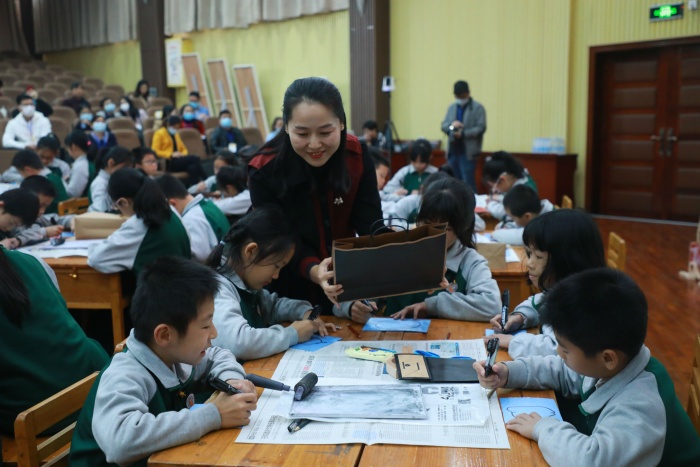 26日,在該校朗言廳內,珠海容閎學校常務副校長、教育部“國培計劃”美術學科專家常曉冰作題為《通過藝術的教育—喚醒·生命系列藝術課程分析》的主題報告,廣東省特級教師、嶺南少年兒童版畫教育研究會會長王鵬發表題為《嶺南少兒版畫之“東西南北中”》的講話,東區街道教育和體育事務中心趙海賓以《東區美術特色學校建設》為題,介紹了東區版畫特色項目。