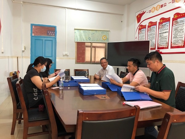 白校長等人先對照《中山市文明校園評分表》,從“領導班子建設”、“思想道德建設”、“活動陣地”、“教師隊伍”、“校園文化”、“校園環境”等七個方面,通過查看有關文明創建文件及圖片資料,了解該校文明創建情況,并對材料進行逐條審查,逐項賦分。
