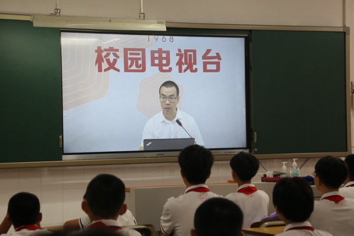 下午突降大雨,按照預案,全體師生留在教室。學校利用校園電視臺,舉行了簡潔明快的開學禮。開學禮必不可少的儀式——展國旗高唱國歌順利進行。在雄壯的國歌聲伴奏下,師生們注目大屏幕上的國旗,一起唱響了國歌。通過電視屏幕,同學們一一認識了學校行政團隊成員。