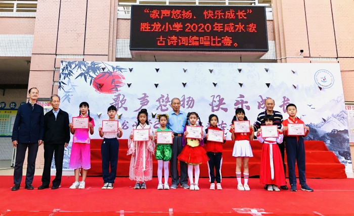 當接到班際咸水歌古詩詞編唱比賽的通知后,全校同學歡呼雀躍,各班級馬上行動起來,挑選適合編唱的古詩詞、根據古詩詞的意境譜寫樂譜、利用課余時間練習演唱……忙碌得不亦樂乎。在各班同學們的精心準備下,精彩紛呈的咸水歌古詩詞編唱節目陸續上演。瞧!小選手們個個可愛俏皮、精神飽滿,表演自信大方、飽含激情。聽!小歌手們獻上的是最甜美、最淳樸、最動聽的天籟之音。選手們精彩的表演贏得了評委們的一致認同。場下的觀眾都聽得入了迷,不時為選手們的精彩表演送上陣陣熱烈的掌聲。校園內掌聲如潮,歌聲不斷。評委們認真負責地為每個參賽班級評分。經過近兩個小時激烈角逐,最終評出一等獎9名,二等獎14名。在中華經典的千古風韻中,勝龍小學2020年“咸水歌?詩教”體育藝術活動月滿載著累累碩果圓滿閉幕。