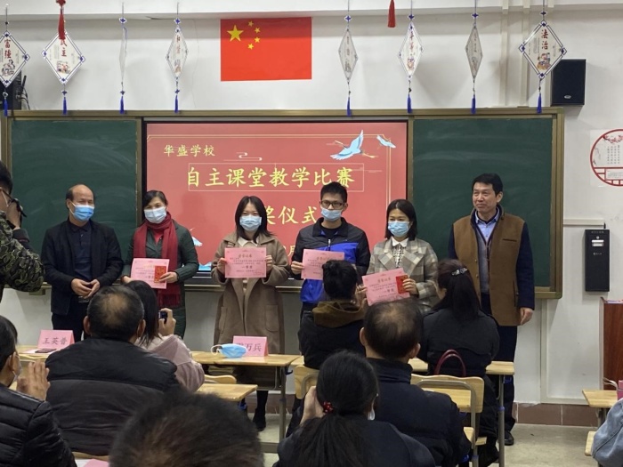 三位科組長分別總結后,教務處主任宣布了本次“自主課堂”教學比賽中獲獎老師名單。李春紅老師、黃亦成老師、吳恩妮老師、賴素文老師獲得一等獎;周金風老師、張秀梅老師、黃華微老師獲得二等獎;歐錦清老師、張根秀老師、何曉丹老師獲得了三等獎。由頒獎嘉賓分別對獲獎的教師頒發了榮譽證書和獎金。