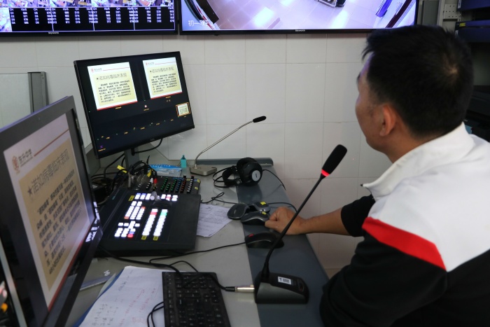 在全校班主任們的注視下,被抽到演練班級的晨檢員組織對同學們進行體溫檢測,填寫好記錄表,并且提醒同學們保持安全距離。演練模擬上課期間,有學生突發咳嗽且嘔吐,上課老師馬上提醒同學們佩戴好口罩,同時打電話通知安保組負責人。在此情況下,疏散組負責人迅速將染病學生帶出教室到醫護人員那里,立即通知疏散組人員,組織學生轉移到備用教室,安撫好其他學生情緒繼續上課。后勤人員立即對剛上課課室進行消毒、通風工作。在消毒通風30分鐘后疏散組重新組織學生回到原班上課。