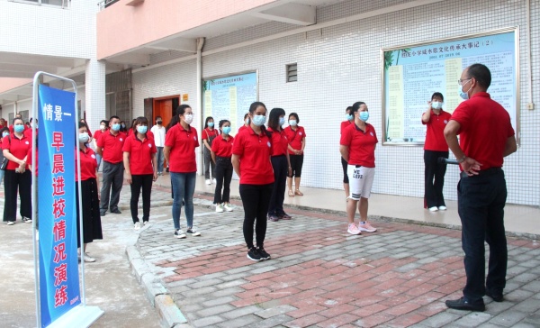 培訓結束后,在學校疫情防控領導小組的帶領下,全體教職工在校園里開展疫情應急處置演練。演練前,白云山副校長對演練的內容、步驟、流程、分工等進行了詳細介紹,確保演練活動順利進行。演練在冼校長的宣布下拉開了帷幕!本次演練共設四個場景,分別是早晨進校情況演練、上課突發事件情況演練和學生就餐情況演練。演練主要模擬在這三個場景中有學生突然出現身體異常,值日老師或上課老師全過程處置流程,包括:老師隔離報告、衛生管理員核實登記、班主任聯系家長、班主任跟蹤匯報、保潔員進行清潔消毒、學校領導上報等。整個演練過程嚴格按照學校應急預案規定流程進行,相關部門分工明確、反應迅速、協調有序,銜接順暢。演練結束后,冼校長對在演練過程中出現的一些細節問題,提出了優化建議,進一步完善了學校防控工作應急預案,為復學后的疫情防控工作打下了扎實基礎。