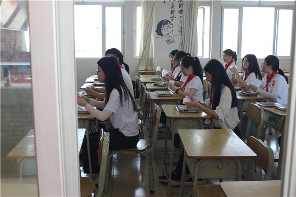 第四個場景是學(xué)生午餐就餐演練。模擬順序?yàn)椤捌卟较词址ān室就座—間隔領(lǐng)餐—正確摘放口罩—就餐—戴回口罩”,期間保持一米間隔距離及避免交談,如果出現(xiàn)打噴嚏或者咳嗽,用手肘遮面或紙巾捂住口鼻以防感染。