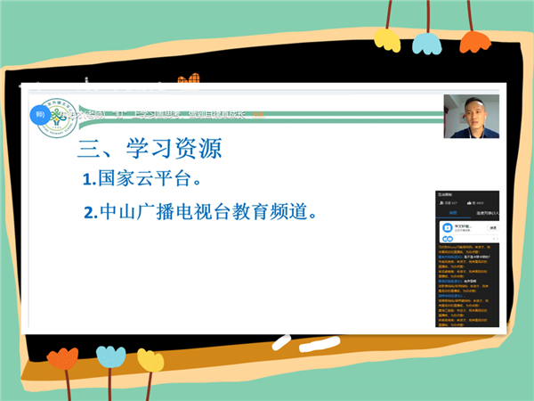 晚上8點,牟進才主任準時發起直播。牟主任在會議時詳細講述了學校關于線上學習、線上教育的實施和具體安排,表明學校是根據省市文件指引組織開展線上教育。學校遵循著“五育并舉”“線上線下相結合”等原則合理安排每日課程,鼓勵學生自學為主,教師在線輔導。