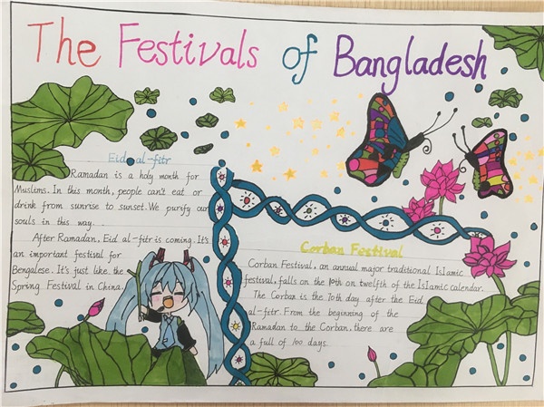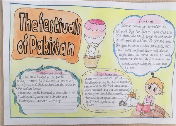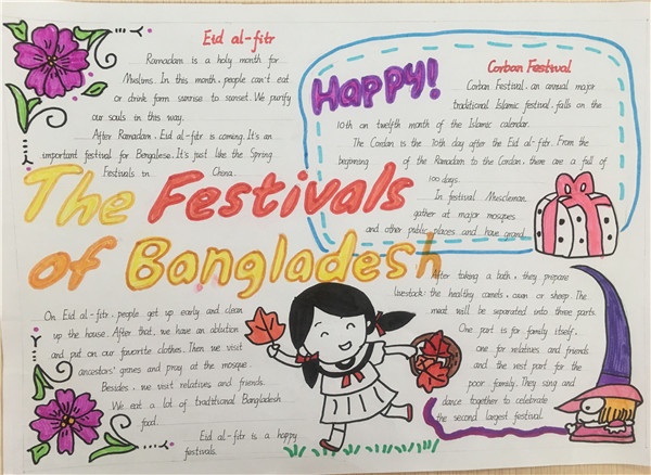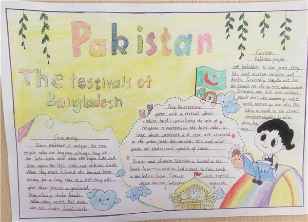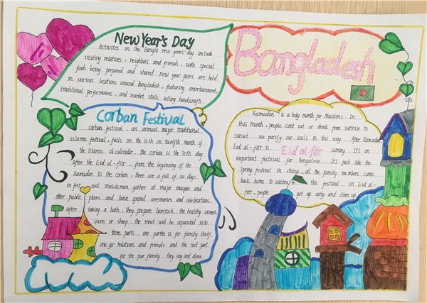 每個年級以一個國家的節日文化為題材繪編手抄報。三年級手抄報的主題國家是吉爾吉斯斯坦;四年級是印度;五年級巴基斯坦;是六年級是孟加拉。本次活動讓學生在充足的時間內完成材料收集、準備和創作。以學生自我創作為主,在廣大學生和英語教師的熱烈響應下得以順利開展。