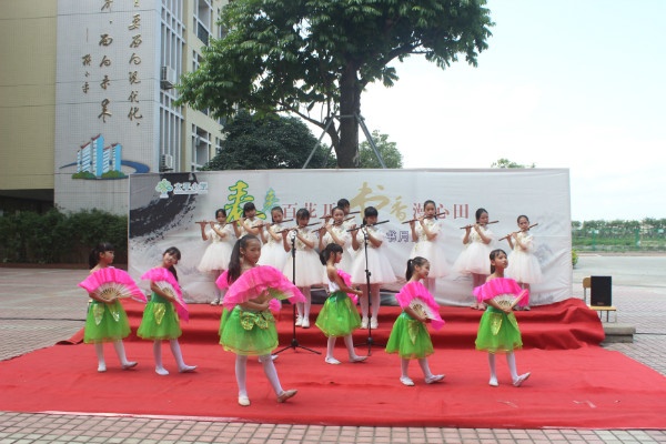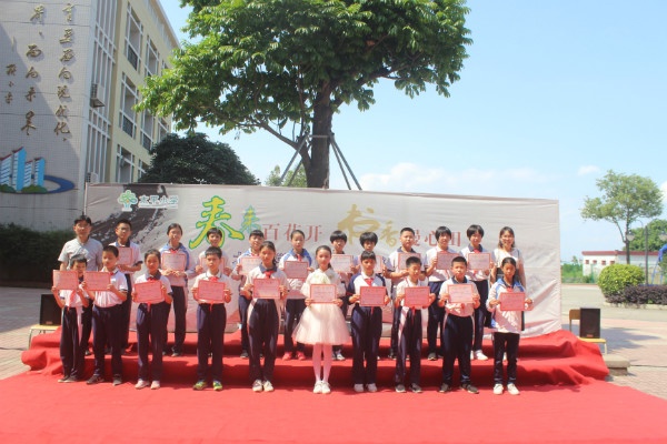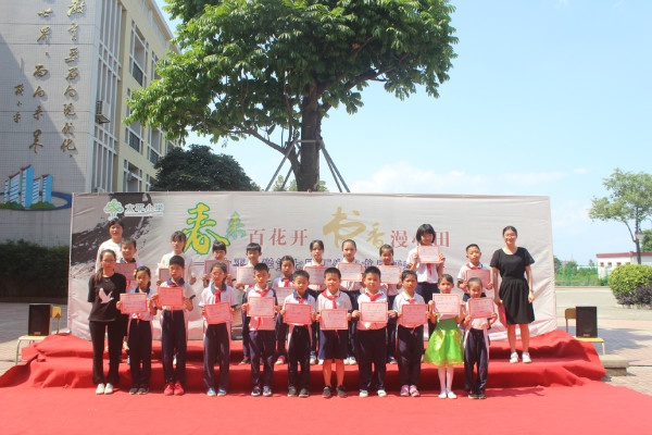 孩子們的竹笛表演熱場之后,梁巧老師便依次宣讀了“閱讀之星”“優秀編輯小組”“書簽制作能手”“優秀小作家”“六大書香班級”“十佳書香家庭”等一系列的獎項并進行頒獎。緊接著由獲得“十佳書香家庭”的家長代表進行讀書月活動感想發言。隨后由四(2)班的學生給全場帶來了精彩的國學經典吟誦。