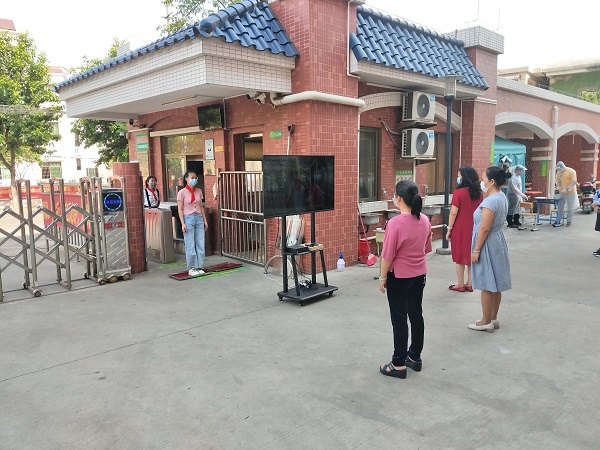 “學(xué)生”按指示牌要求前后相間一米成兩路縱隊(duì)步行,經(jīng)過保安室門前體溫檢測(cè)區(qū)進(jìn)校門。紅外線體溫自動(dòng)探測(cè)儀器可以同時(shí)跟蹤多個(gè)目標(biāo)進(jìn)行測(cè)溫,經(jīng)過的每個(gè)同學(xué)的頭像及額溫均顯示在屏幕,如果有體溫超過37.3度的則會(huì)自動(dòng)報(bào)警提醒。站在屏幕前的值日老師也在密切監(jiān)視,如果發(fā)現(xiàn)體溫接近發(fā)燒線的則再用人工探測(cè)儀復(fù)查。