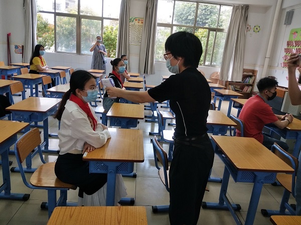 其中大致分為兩種狀況。第一種,體溫合格的有序進(jìn)入學(xué)校,踩過消毒地毯,到保安室窗前洗手臺(tái)按“七步洗手法”洗手,然后按路線間隔1米以上、安靜、有序地進(jìn)入到教室。整個(gè)過程都有值日老師在指導(dǎo)和監(jiān)督。第二種,入校時(shí)當(dāng)值日老師發(fā)現(xiàn)一名學(xué)生體溫超過了37.3,其中一名值日老師立即將其帶到臨時(shí)健康觀察室。到達(dá)觀察室后,醫(yī)護(hù)組人員幫其重測(cè)體溫,并詢問近期是否有流行病學(xué)史:14天內(nèi)有無湖北等重點(diǎn)地區(qū)旅居史、途經(jīng)史,或有無與確診、疑似病例接觸史,或者有無與境外、國(guó)外人員接觸史等。若該同學(xué)說均沒有,則醫(yī)護(hù)組人員打電話通知家長(zhǎng)再次詢問核實(shí),并通知家長(zhǎng)前來學(xué)校,帶小孩回家休息觀察或者適時(shí)就醫(yī)。若有發(fā)燒而且有流行病學(xué)史的同學(xué),則馬上通知學(xué)校疫情報(bào)告人陳福業(yè)主任。接報(bào)告后,學(xué)校疫情防控領(lǐng)導(dǎo)小組馬上啟動(dòng)應(yīng)急預(yù)案,通知東升醫(yī)院派車前來接診轉(zhuǎn)運(yùn),通知鎮(zhèn)疾控中心、鎮(zhèn)文體教育局協(xié)助排查和調(diào)查。學(xué)校疫情排查統(tǒng)計(jì)組、線上教育及開學(xué)調(diào)控組、疫情防控宣傳與輿論導(dǎo)向組、疫情處置組、教職工健康監(jiān)控組各司其職,立即采取相關(guān)的防控措施。