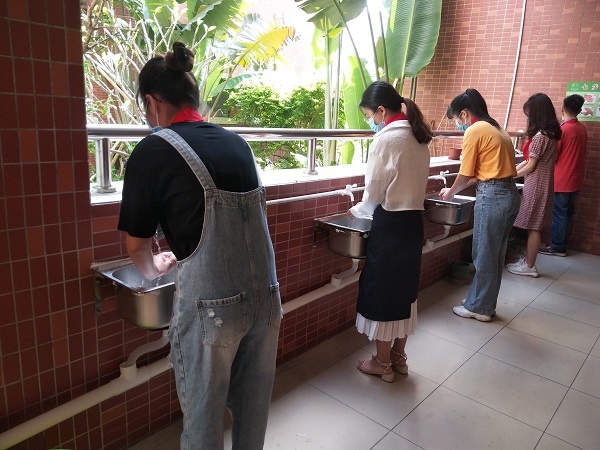 上午最后一節(jié)課下課了,上課老師指揮好學(xué)生間隔1米有序排隊(duì),帶領(lǐng)學(xué)生到洗手池進(jìn)行手部清潔,按“七步洗手法”使用洗手液、流動(dòng)自來水清潔雙手,用干凈紙巾擦干。洗手后,老師指揮學(xué)生有序地回到教室坐好,按照單雙小組先后就餐順序,到教室門外領(lǐng)飯。然后回到座位摘下并正確折疊保存好口罩,安靜地坐好吃飯,避免交談聊天。期間有個(gè)同學(xué)打噴嚏、咳嗽,老師指導(dǎo)他用紙巾捂住口鼻或采取肘部遮掩。用餐后,學(xué)生用濕紙巾抹干凈嘴巴,戴上口罩,按要求有序地到教室外面擺放好餐具。