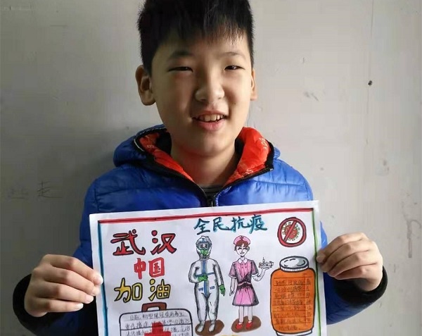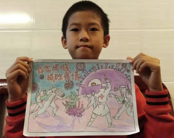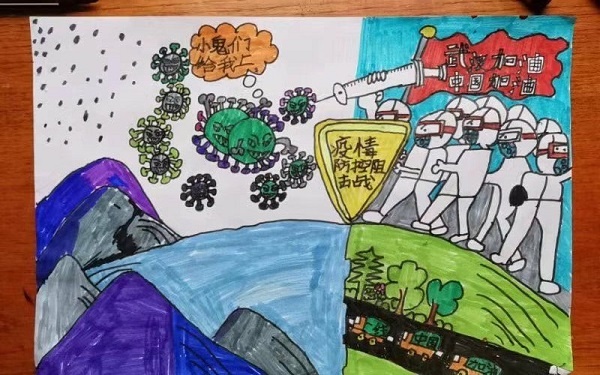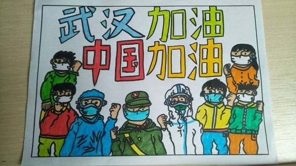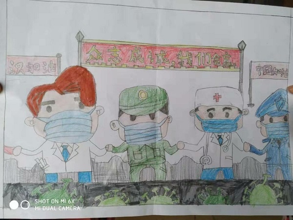 活動信息一發出,孩子們一如既往地積極配合做好相應任務。據班主任反映,從23日起就陸陸續續收到了孩子們的海報作品。可見孩子們的高漲熱情。收集起來的海報設計形式多樣,有線條畫的,有水彩畫的,還有簡筆畫的,有些混合有文字以表達自己強烈內心感受的等等。從孩子的作品內容中可以看到,那點點水墨,那一筆一畫,都是他們用心用情專注完成的。從中,大家也能感受到孩子們盼望祖國盡早走出疫情陰霾的急切心情,更能夠看出孩子們作為祖國的一員的責任心——祖國有需要,自己就要出一份力的高度責任感。