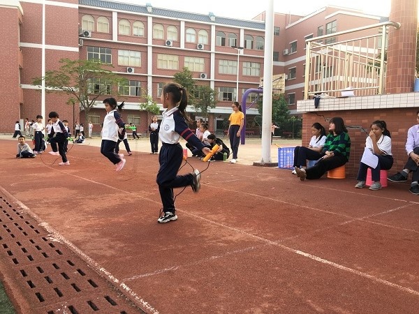 隨著拔河比賽的落下帷幕,緊接著舉行的是27日下午的跳繩比賽,跳繩比賽可謂是讓觀眾們應接不暇的一個項目。每班的參賽選手們一起上場站成一列,裁判老師的哨聲一響,參賽的同學們同時開始跳繩。繩子在快速轉動,啦啦隊在大聲地為本班的選手加油。一分鐘時間很快過去了,這一輪比賽結束,在這項持續時間短但耗體力強的比賽中,同學們的臉上雖然有疲累的神態,但更多的是完成比賽的喜悅感,畢竟在比賽中,參與更重要!