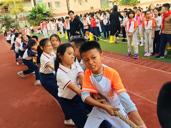 11月26日下午開展了第一個體育項目——拔河比賽,每班出賽人數為20人,出賽的選手們都摩拳擦掌準備著。伴隨著裁判老師的哨聲響起,在啦啦隊的同學們的歡呼聲中,繩子兩端的選手們都努力地把繩子往后拉,有的身體后傾,有的牙關緊咬,有的甚至大吼為自己和隊友們增加士氣。在場的無論是老師還是同學,都在為選手們加油鼓勵,有的甚至也做出了身體傾斜的動作,仿佛這樣能為選手們增加力量一樣。拔河比賽有效地增加同學們之間的凝集力,也為促進更親近的師生關系提供了契機。