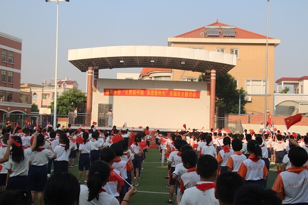 9月30日上午7:40活動準時開始,升旗手、護旗手踏著整齊劃一的步伐,把國旗護送至升旗臺。8:00,國旗飄揚,國歌雄壯,全場肅穆,齊聲高唱,五星紅旗冉冉升起,點燃了在場每一個裕民人的愛國熱情。