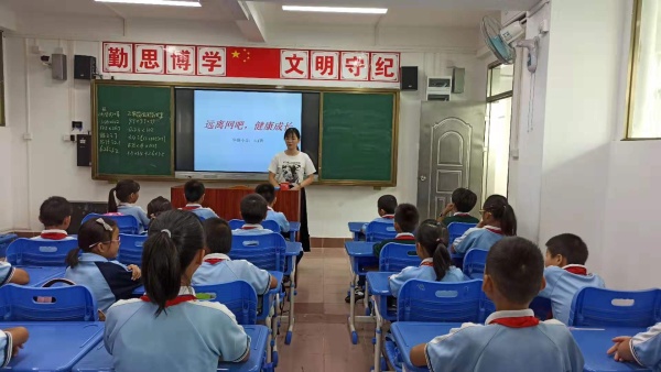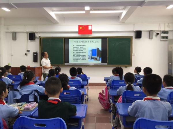 班會活動上,各班班主任通過精美的多媒體課件、圖片、視頻、并以講故事、繪畫等方式,給學生們上了一堂關于“遠離網吧,健康成長”為主題的班會課。由于目前的網絡管理還不夠規范,網絡上存在大量帶有暴力、色情等不良內容的游戲,一些意志與自控力較差的學生,難以抵制有害信息的侵蝕,沉溺于網吧,沉迷于網聊、網絡游戲大戰中,逐漸迷失了人生的方向。為了上網,有些同學竟欺騙父母學校有所收費,放心大膽的從父母手中接過凝聚血汗的鈔票。純潔的心靈受到了毒害,眼睛、身體受到了損害,學習受到了極大的影響,有的甚至走上了違法犯罪的道路。網絡世界五光十色,網絡世界引誘無限。但是,網絡中不良信息的損害也是日益顯示,尤其是網吧,往往是各類惡性事件的原發地,不容忽視,對于青少年來講,網絡道德教育火燒眉毛。這節主題班會課,讓同學們充分認識到網絡對于青少年的影響有利有弊,引導同學們增強上網的文明意識和安全意識,自覺構筑抵制不良信息沖擊的“防火墻”。
