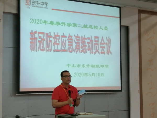 5月10日下午,東升中學召開專題工作會議,會后舉行第三次新冠防控應急演練活動。該校全體行政人員和七八年級所有教師參加上述會議與活動。此次專題工作會議分為兩大部分:一是七八年級的班主任會議;二是七八年級全體教師新冠防控應急演練動員會議。在班主任會議會上,東升中學馮釗順副校長總結分析了該校第一批學生返校復學情況,及時調整工作重點和對策,并具體部署第二批學生返校復學準備工作。在新冠防控應急演練動員會議上,東升中學吳耀光校長強調:一是要大力營造一個指揮順暢的返校復學工作局面,逐一排查落實,查漏補缺,確保第二批學生返校復學工作涉及到的疫情防控、物資保障、校園安全、食品安全等工作落實到位。二是要高標準嚴要求開展 “全覆蓋、無死角”校園衛生整治活動,合理利用各方資源,優化調整教室、食堂、宿舍等功能場所,為師生提供一個清潔衛生安全的校園環境。三是要做好家校聯系,主動和教師溝通了解孩子在校狀態。請家長們信任孩子,信任老師,信任學校;四是要關注重點群體和特殊學生,加強心理教育和疏導,確保關心關懷到位,做到“一生一檔”;同時,對于困難家庭學生,要給予適當的幫扶。接著,該校德育處黎國明副主任針對第二批學生返校后如何有效落實疫情防控措施、如何甄別現階段普通傳染病防控、如何教育引導學生養成勤洗手講衛生良好習慣等方面進行了有益的指導和提出了具體的要求。