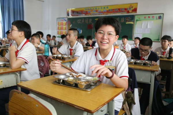 中午11:50是就餐時間,各班級學生在東升中學行政和部分教師的引導下,以前后1.5米的間隔有序排隊到一樓架空層領取飯堂特備盒飯,然后再回到班級就餐。為了營造輕松愉快的氛圍,德育處還利用校園電視臺為大家播放了有趣的電影。