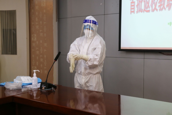 在吳校長講話之后,東升醫(yī)院婦產(chǎn)科黎雪玲護士長和葛香萍護士還為與會人員現(xiàn)場親自演示了“七步洗手法”和“防護服正確穿脫法”。