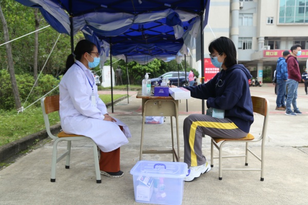 首先是組織初三級全體學(xué)生回校進行核酸檢測。為進一步鞏固新冠肺炎疫情防控成果,切實維護廣大師生員工生命安全和身體健康,全力保障春季開學(xué)工作平穩(wěn)有序,為復(fù)學(xué)提前做好準(zhǔn)備。按照上級文件要求,東升中學(xué)24日早上8:00分時分批開展初三學(xué)生新冠病毒核酸檢測工作。(校內(nèi)行政人員、初三級教職員工和后勤人員的核酸檢測采樣工作已于4月17日完成。)東升中學(xué)吳耀光校長說:“對本次涉及初三年級返崗返校教職員工和學(xué)生,我們做到‘應(yīng)檢盡檢’,為師生們的生命安全和身體健康筑牢防線。”在東升中學(xué)現(xiàn)場,學(xué)生根據(jù)學(xué)校通知的時間準(zhǔn)時到校門口等候區(qū),接受測溫后進入校園,依次到采樣點領(lǐng)取條形碼和采集管,等待采樣點“叫號”,每位同學(xué)排隊間隔保持1.5米以上。采樣現(xiàn)場設(shè)置了4個采樣組,每個組有兩名東升中學(xué)的教師協(xié)助登記信息和派發(fā)采集管,還有兩名“全副武裝”的醫(yī)護人員。完成采樣后,學(xué)生按指引路線有序迅速離開校園。