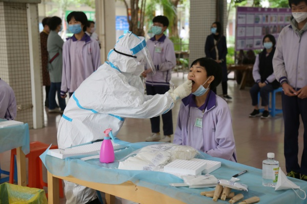 筆者觀察到,在24日上午10:30左右,負責(zé)采樣的醫(yī)療檢測公司就已經(jīng)完成了該校497名初三學(xué)生的核酸檢測采樣。另外,在東升中學(xué)采樣點進行采樣檢測的,除了東升中學(xué)初三的學(xué)生之外,還有在東升鎮(zhèn)生活的現(xiàn)在在讀的各校高三學(xué)生850多人。之所以采用這樣“就近原則”,是為了減少不必要的人員遠程流動,確保學(xué)生健康安全。據(jù)悉,樣品將被送到廣州檢測,兩天之內(nèi)將全部公布檢測結(jié)果。
