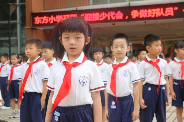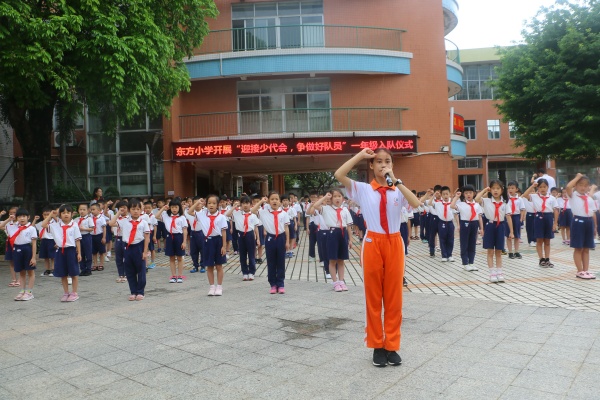 接著,六年級(jí)的老隊(duì)員為一年級(jí)的新隊(duì)員佩戴上鮮艷的紅領(lǐng)巾。全體新隊(duì)員在大隊(duì)委員的帶領(lǐng)下,高高地舉起右手大聲宣誓:準(zhǔn)備著,為共產(chǎn)主義事業(yè)貢獻(xiàn)力量!此刻,大隊(duì)輔導(dǎo)員梁旺玲老師宣布東方小學(xué)少先隊(duì)大隊(duì)部成立一年級(jí)中隊(duì)并表示衷心的祝賀。