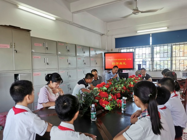 上午八點整,散學禮如期開始。由于當天的高溫預警,為了學生們的健康和安全,散學禮主會場設在了學校會議室,各班教室為分會場,每班派一名學生代表在會議室出席散學典禮。同學們精神昂揚,帶著期待又緊張的心情認真聽講。暑假將至,安全第一。首先,豐聯小學法治副校長林慶初警官給同學們進行了假期安全教育,包括防火防盜防詐騙等等,特別提醒了防溺水和防疫的注意事項。林警官強調,安全無小事,生命是最寶貴的,希望同學們認真遵照執行,過一個愉快又安全的暑假。